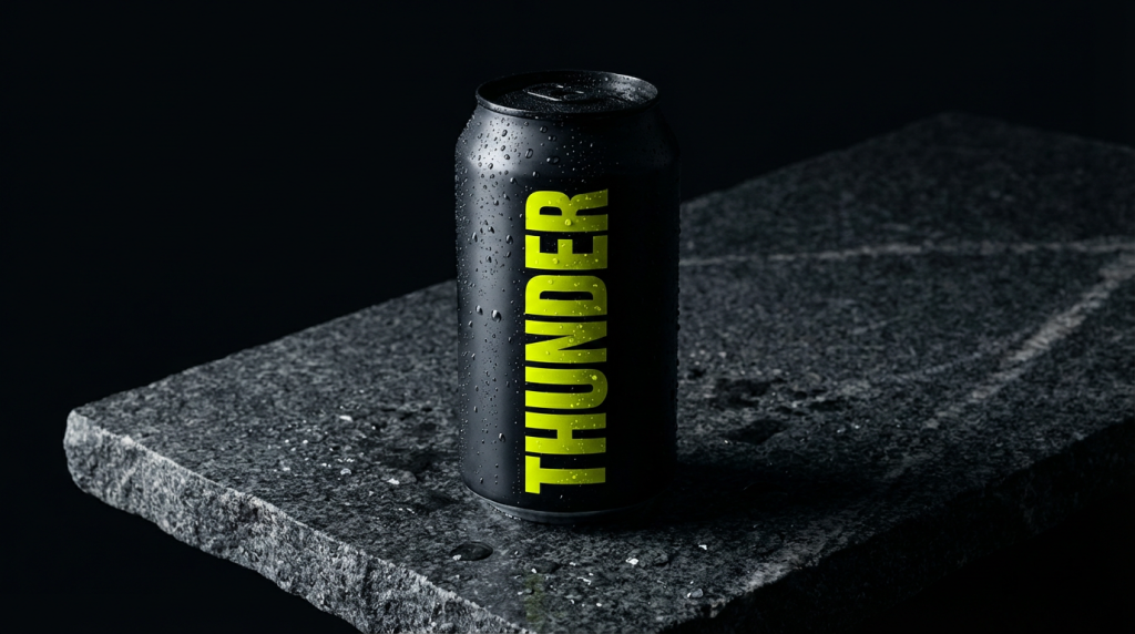 “A professional product photography shot of a matte black energy drink can on a dark granite table. Water droplets on the can. The brand name ‘THUNDER’ is written vertically in neon yellow bold font. Cinematic lighting, 4k resolution.”