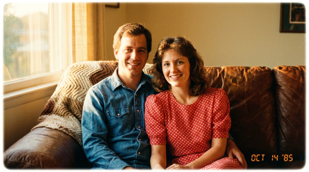 “Convert this photo into a 1980s retro-style couple portrait. The couple should be smiling, sitting on a vintage brown leather sofa, with warm golden lighting. Outfits: man in a blue denim shirt, woman in a polka-dot dress. Add soft grainy film texture and a faded photo album look.”