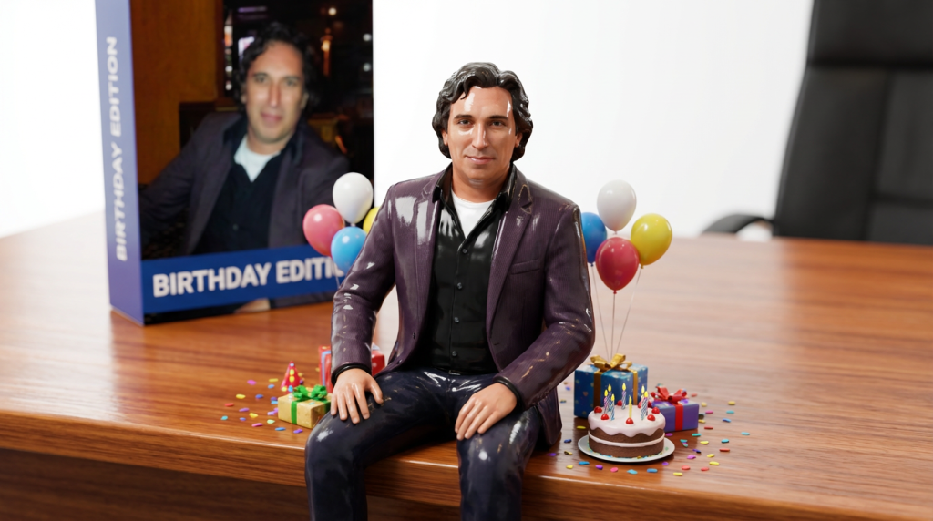 “Create a 3D miniature figurine of [upload photo of yourself or a pet]. The figurine should be placed on a wooden desk with birthday decorations around it. Style: hyper-realistic plastic resin texture, glossy finish, bright studio lighting, collectible figurine style packaging in the background.”