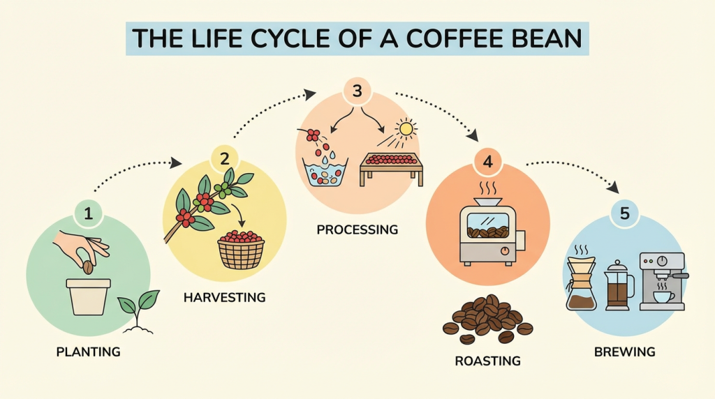 “Create a detailed infographic about the life cycle of a coffee bean. Include 5 distinct steps from ‘Planting’ to ‘Brewing’. Use a clean, minimalist vector style with a pastel color palette. Ensure all text labels are spelled correctly and placed legibly next to their corresponding icons.”